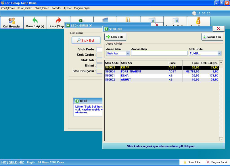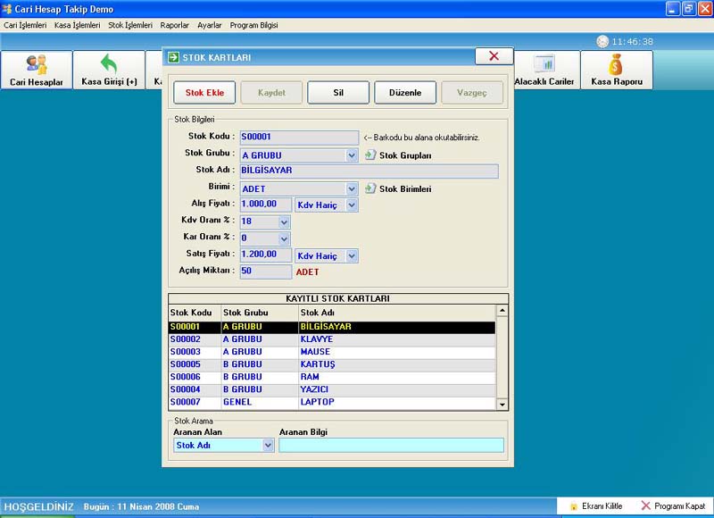 Stok işlemlerinde stok kartı açıyoruz öncelikle ,stok kartına ürünümüzü tanıtmamız gerekiyor ki alış yada satış yapacağımız zaman kolayca stok bul butonunu tıklayarak stoğumuzu bulabilelim.Stok ekle butonunu tıklayarak stoğumuzu ekliyoruz açılış miktarına mevcut stoğumuzu giriyoruz yada "0" olarak girebiliriz.